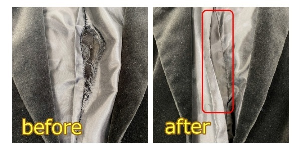 ジャケット・裏地の破れ直し対応事例 2023.08.27 カテゴリー: 修理・リペア タグ: キズ・穴・やぶれ・ほつれ修理 📸ジャケット・裏地の破れ直し対応事例 📝裏地が破れて着れなくなってしまったので、仕舞ったままにしてあったジャケットをお直しいたしました。最初に袖の裏地をほどいてから後ろ身頃まで裏返し後に裏地の背中心の破れを補強します。そのまま縫い閉じると余裕がなくて破れてしまうので、裏地にアーモンド形に加工した生地を縫い足しました。裏地に余裕ができたので、動きも楽になります。お気に入りのジャケットで楽しくお出かけくださいね🌷
