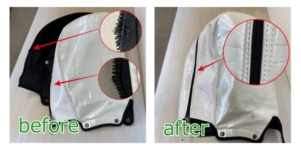 バッグ・ファスナー全交換の対応事例 2023.08.27 カテゴリー: 修理・リペア タグ: 鞄・財布の修理 📸バッグ・ファスナー全交換の対応事例 📝バッグ・ファスナーの全交換をさせていただきました。コイルファスナーのコイル縫い止めの糸が傷んで切れており、補強では難しい状態でしたので全交換での対応となりました。ファスナーのカーブ部は使用で負荷がかかり傷みやすい部分ですので全交換になるケースが多くあります。中には部分的な補強で対応できるケースもありますので、お気軽にご相談くださいね☺