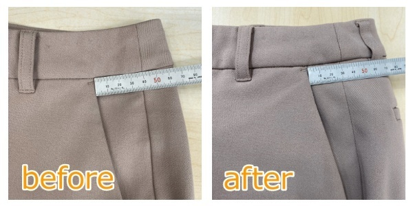 パンツのウエストを4センチ詰めました。ウエストが緩く、安全ピンでサイズ調整して着用されていたお客様。着用の度にピンで止めるのは危ないけれど、ベルトは使いたくないのでウエストのサイズ直しをお願いしたいとのご依頼でした。ベルトを使って着用されてもしわができる場合もありますよね。丁度いいサイズでお召いただけるようになり喜んでいただけました。