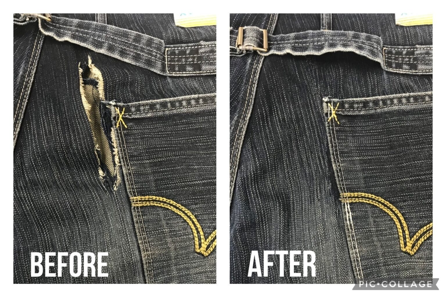 後ろポケット横の裂け 2023.08.27 カテゴリー: 修理・リペア タグ: ジーンズリペア 📸後ろポケット横の裂け👖 📝後ろポケット横の破れを修理いたしました✨使用頻度が高いので、破れやすい箇所です💦 このような破れなども是非みつみにご相談くださいませ♫