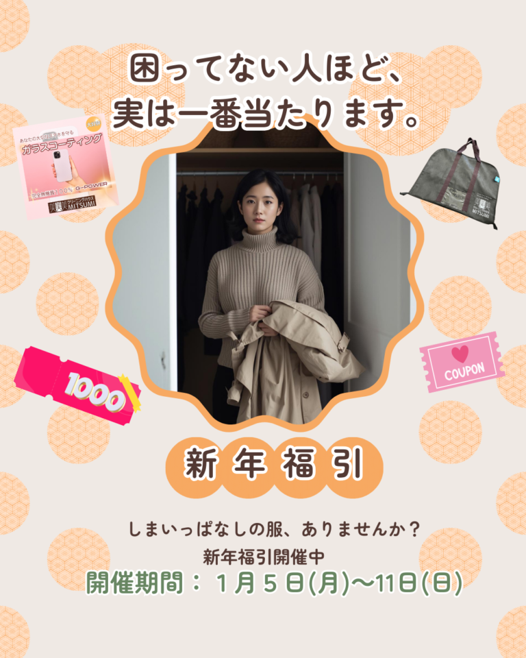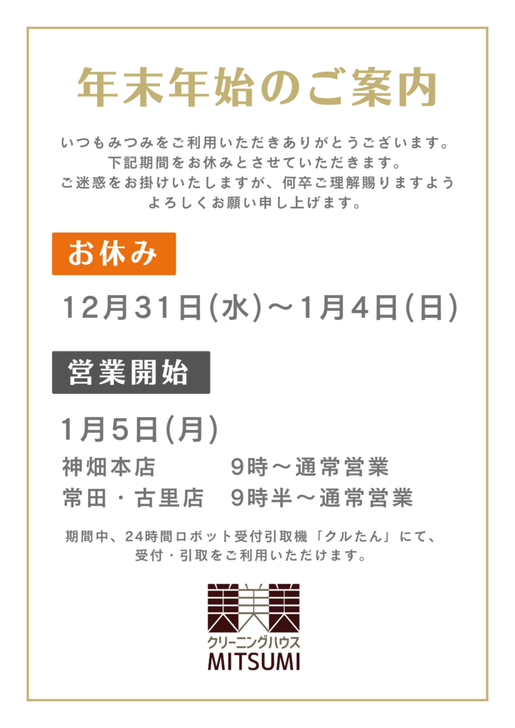 新年あけましておめでとうございます。旧年中は、たくさんのご縁をありがとうございました。 新しい一年の始まりに、また皆さまの大切な一着と向き合えることを、私たちはとても嬉しく思っています。 礼服や学生服、コートやダウンなど […]