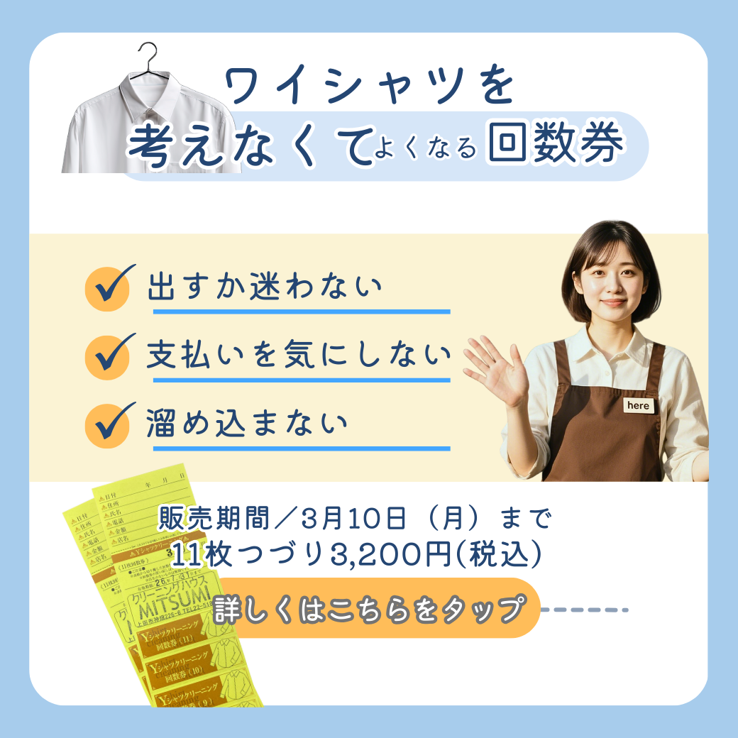 ワイシャツをよく出される方におすすめの回数券をご用意しています。毎回の支払いを気にせず、迷わず出せてクリーニングがラクに。3月10日までの期間限定です。