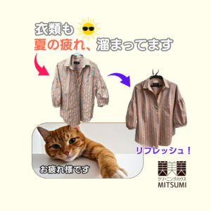 残暑お見舞い申し上げます厳しい暑さが続いておりますが、皆さまいかがお過ごしでしょうか。 私たちが暑さで疲れてしまうように、洋服も汗や皮脂を吸い込み、お疲れの状態になっています。放置してしまうと黄ばみやニオイ、カビの原因と […]