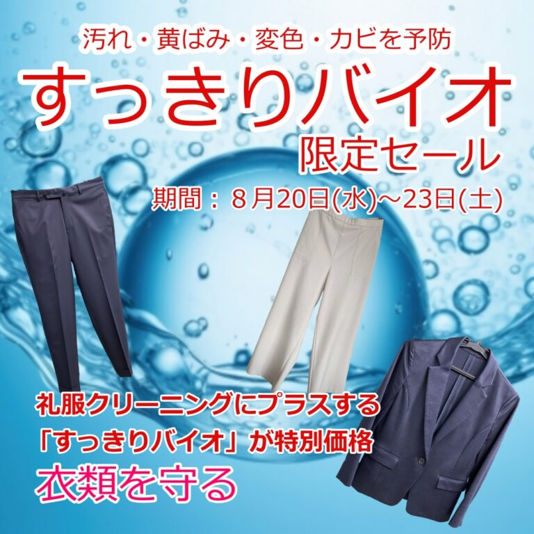 すっきりバイオ期間限定セールのご案内 夏に着た礼服には汗がたっぷり💦そのままにすると黄ばみやカビの原因に…‼️ 👔 そんな予防にぴったりなのが「すっきりバイオ」🫧8月20日(水)~23日(土)限定全店同時開催礼服クリーニ […]