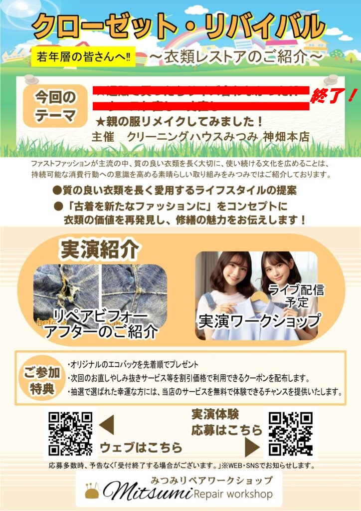 持続可能な社会にご賛同いただける若年層の皆さんへ 「クローゼット・リバイバル – 衣類レストア相談」へのご招待 【今回のテーマ】・通販で購入したら、サイズがあわなかった!・親(知人)から譲りうけた服のリメイク!ファストフ […]